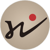 A logo with a beige circular background, black cursive-style text, and a red dot above the text.